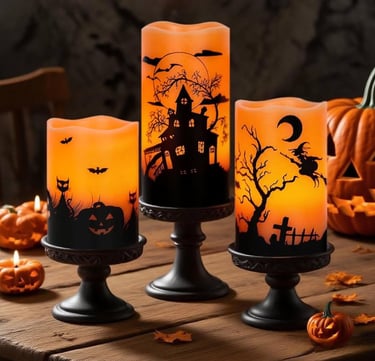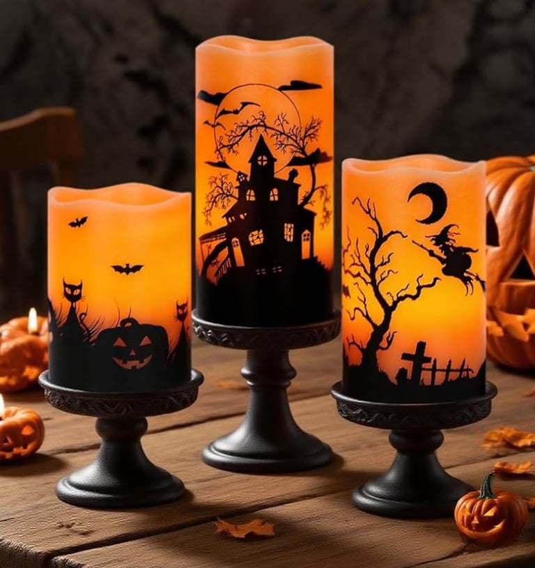 This set of three flickering flameless candles brings the perfect Halloween ambiance with their glowing sunset scenes of haunted houses, witches, and pumpkins. Not only do they add a spooky-charming touch to your décor, but they also come with a rechargeable base—so you can enjoy the glow without the hassle of replacing batteries.